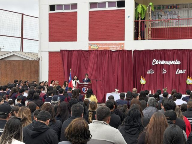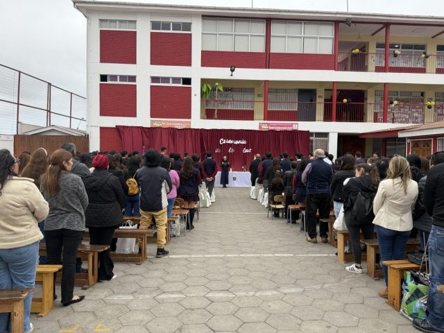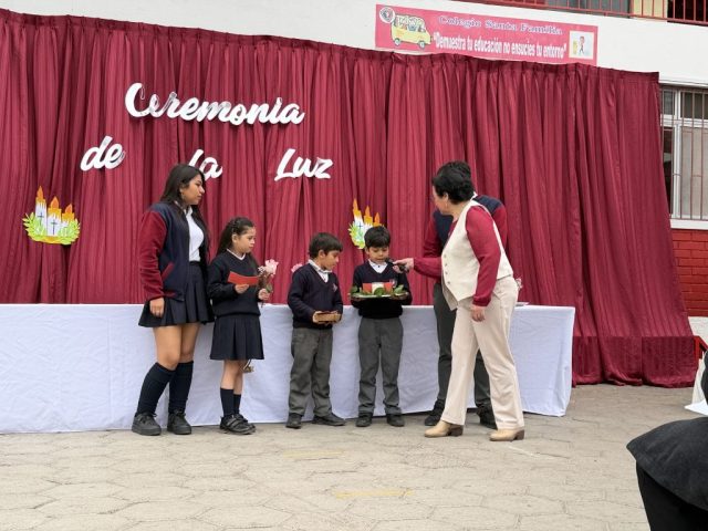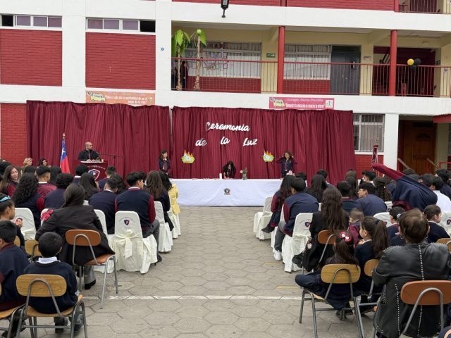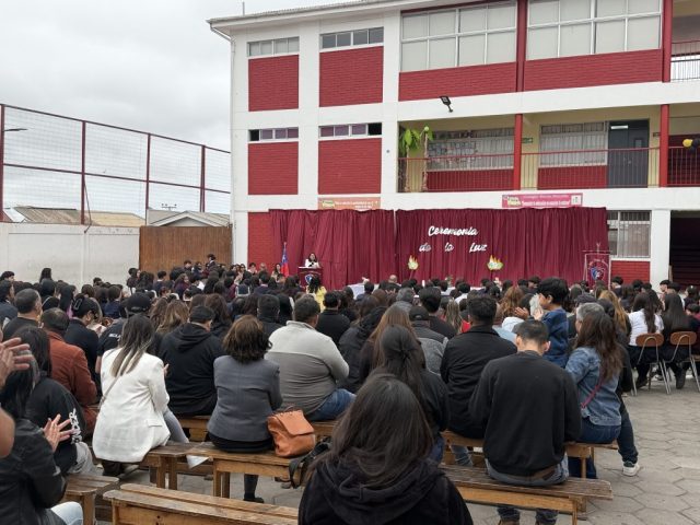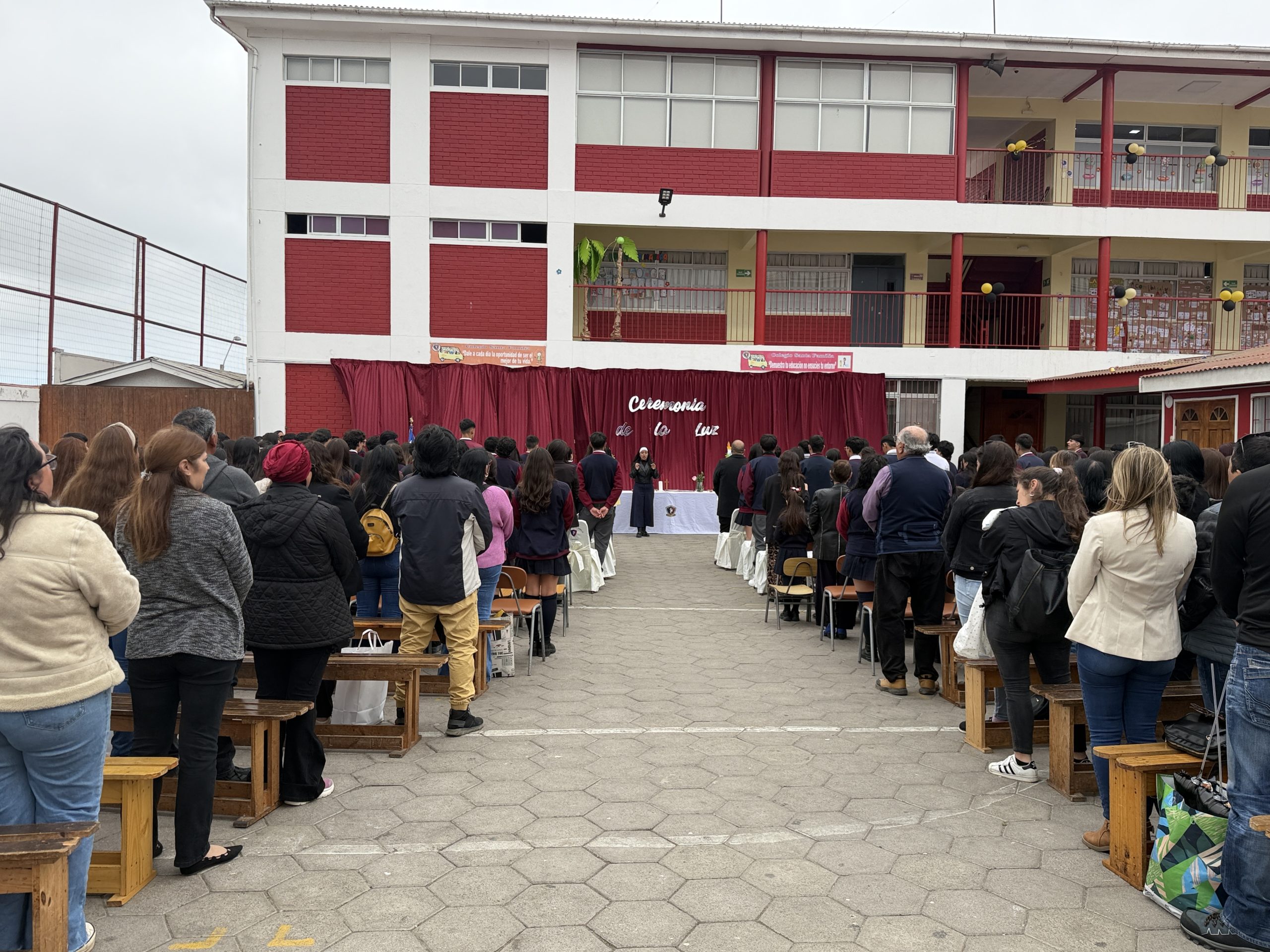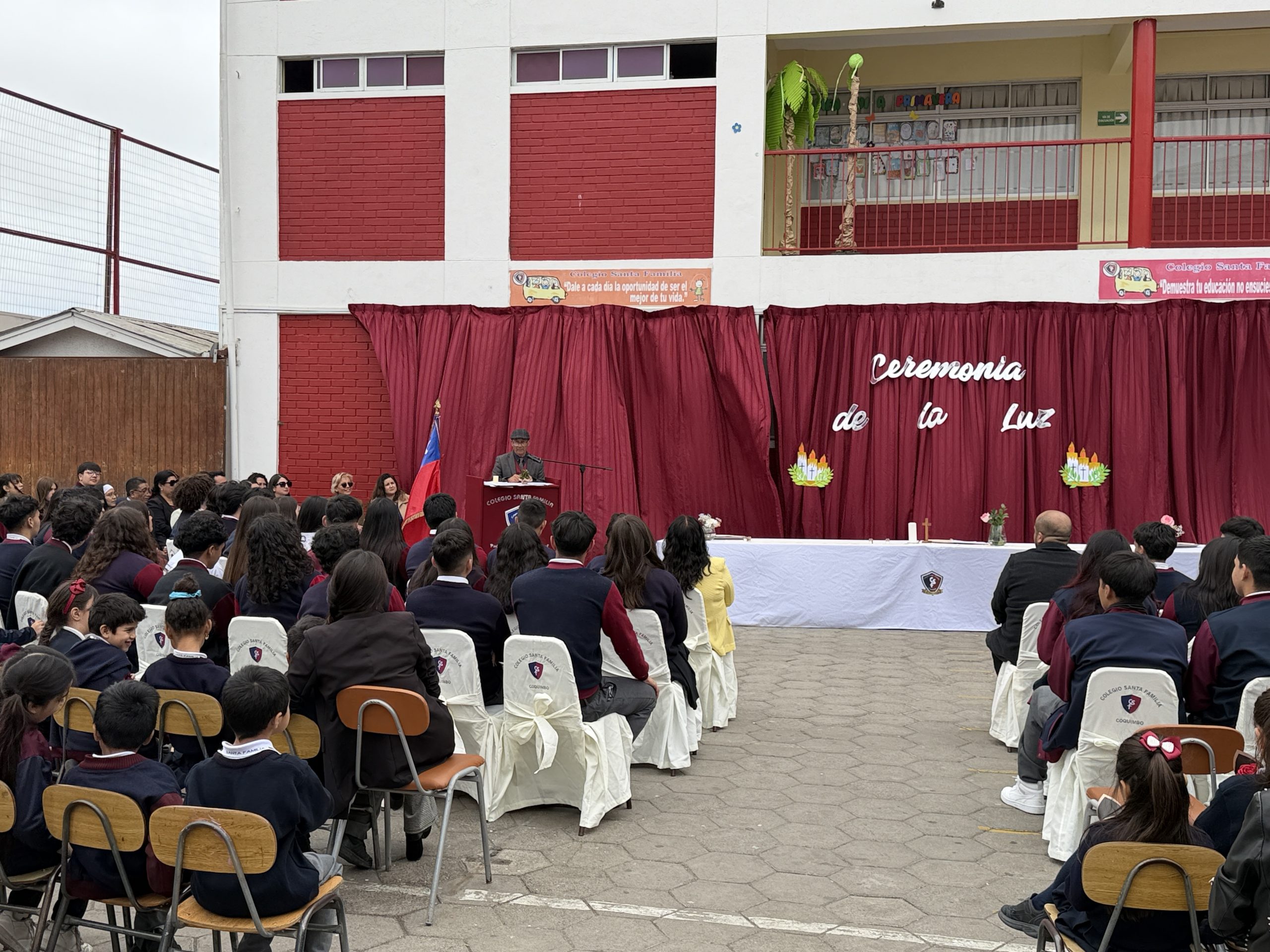 Posteriormente, se realizó la tradicional Ceremonia de la Luz, momento en que dos representantes de IV° Medio —Daniel Tapia Araya y Elisa Álvarez Favre— entregaron la luz del conocimiento a sus ahijaditos de 1° básico, simbolizando el traspaso de aprendizajes, valores y esperanza a quienes recién comienzan su camino escolar. Los pequeños recibieron esta luz con emoción, acompañados por el aplauso de toda la comunidad.