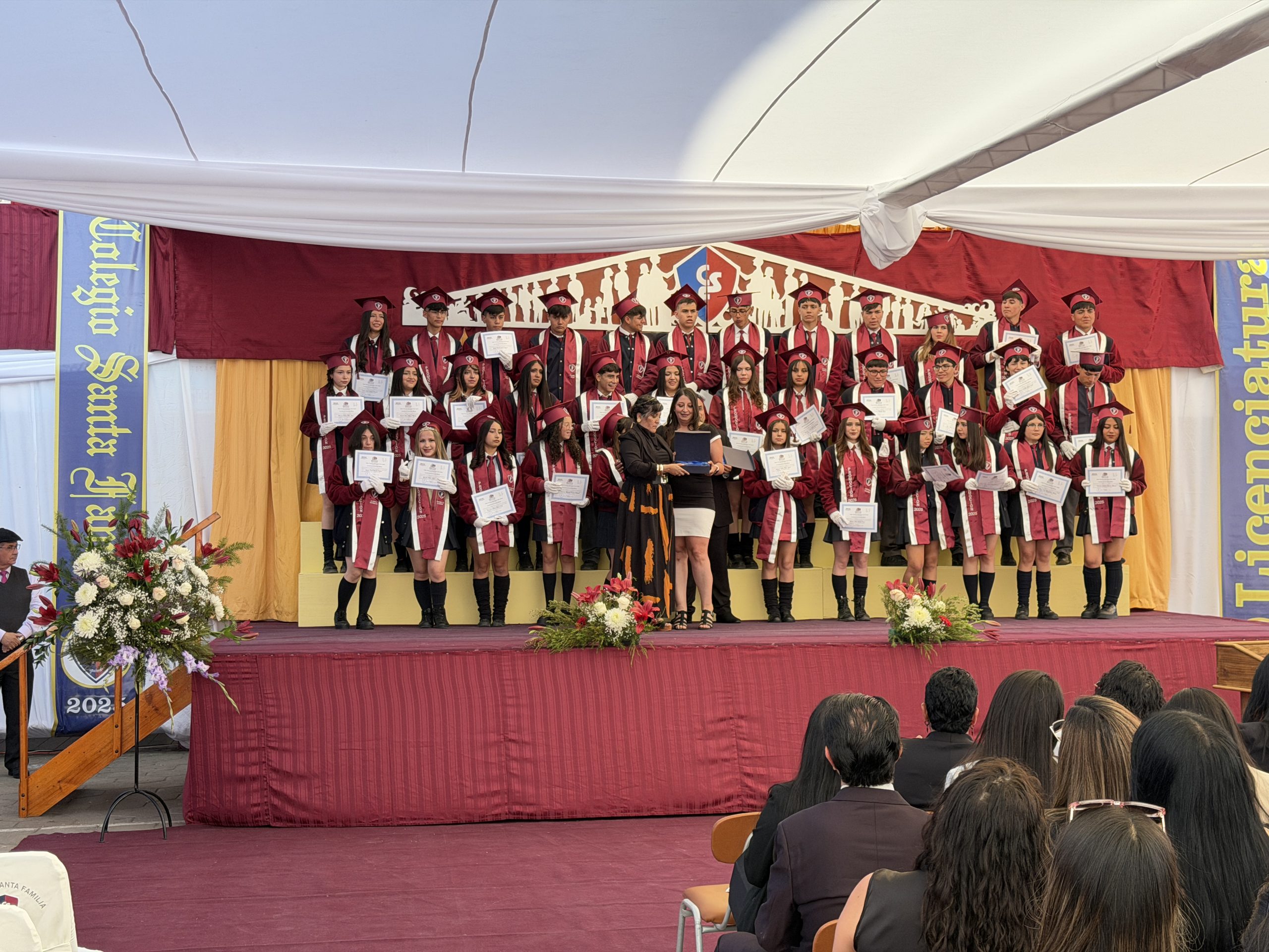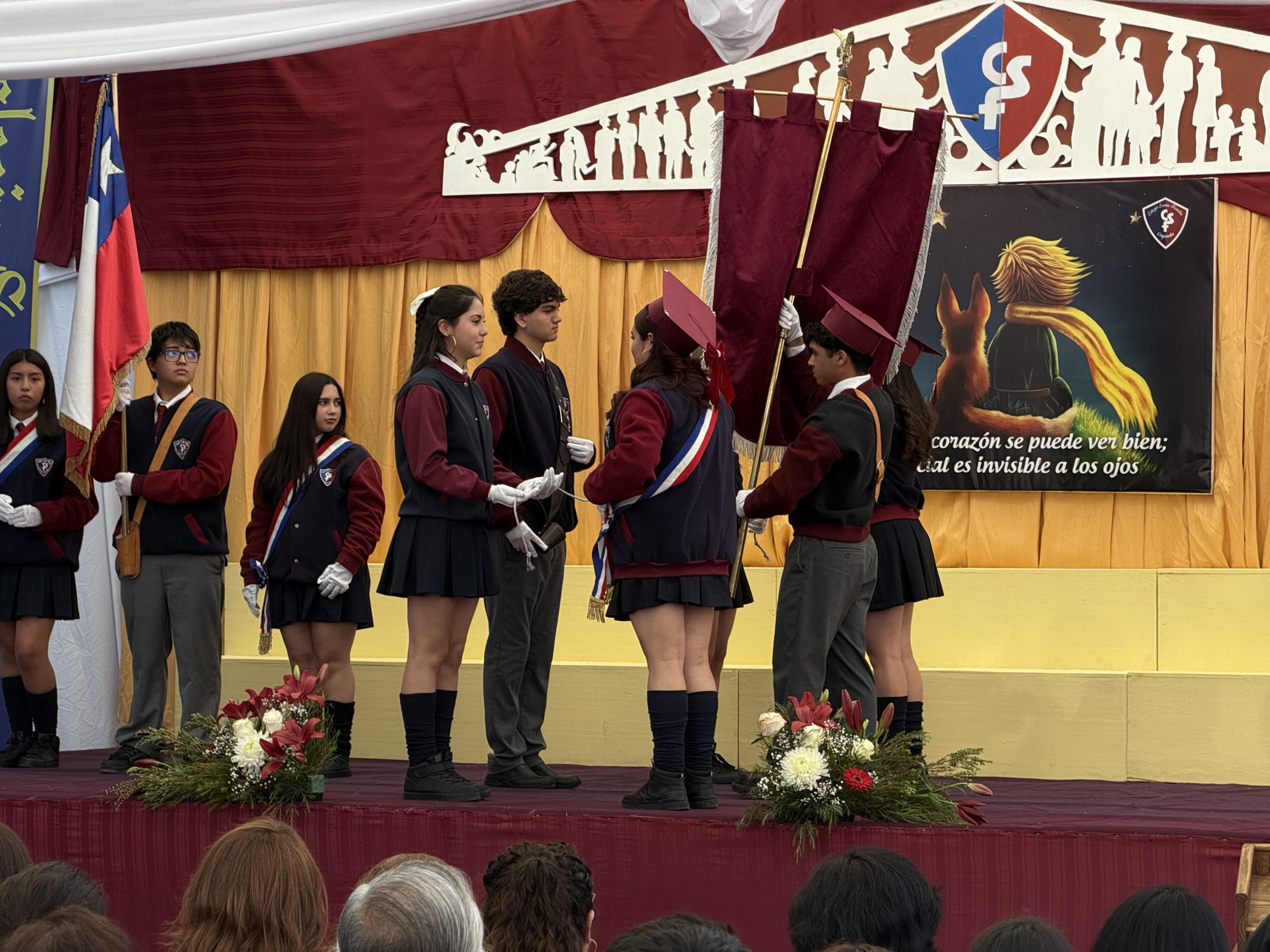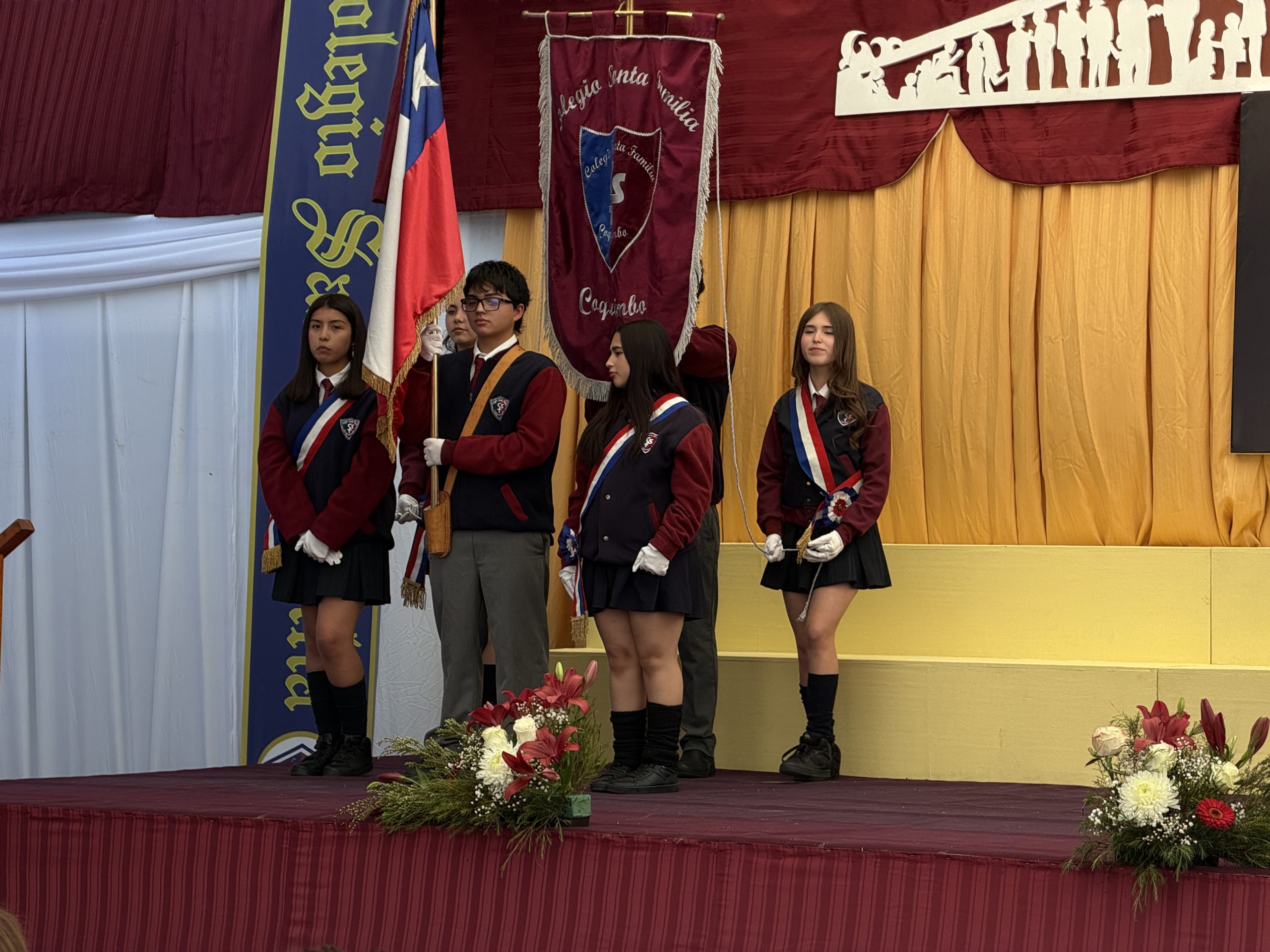 Uno de los hitos más significativos fue el Cambio de Estandarte y Bandera, donde los alumnos salientes entregaron los emblemas institucionales a los estudiantes de 3° Medio, confiándoles la misión de representar con gallardía los valores del Colegio Santa Familia.