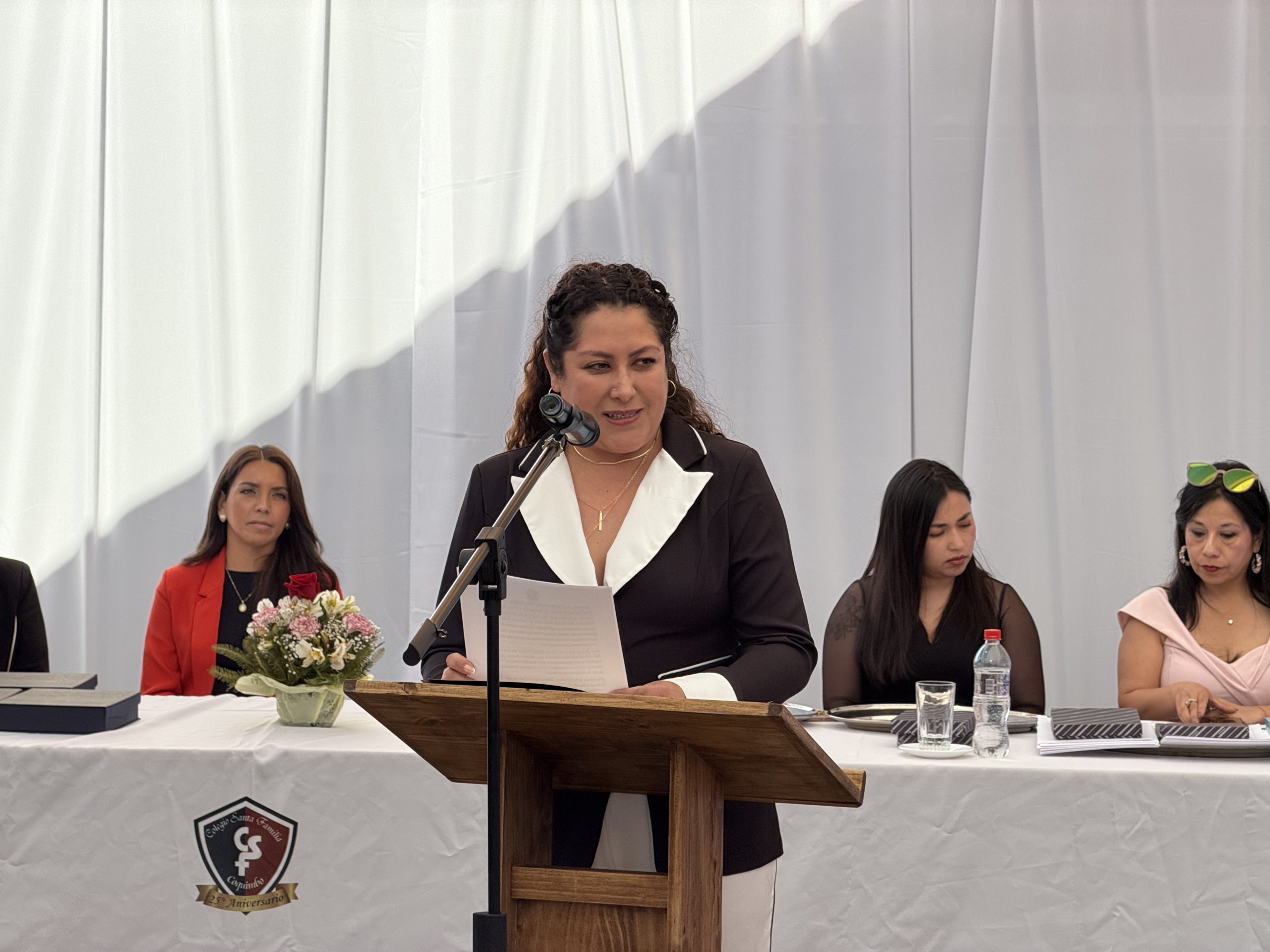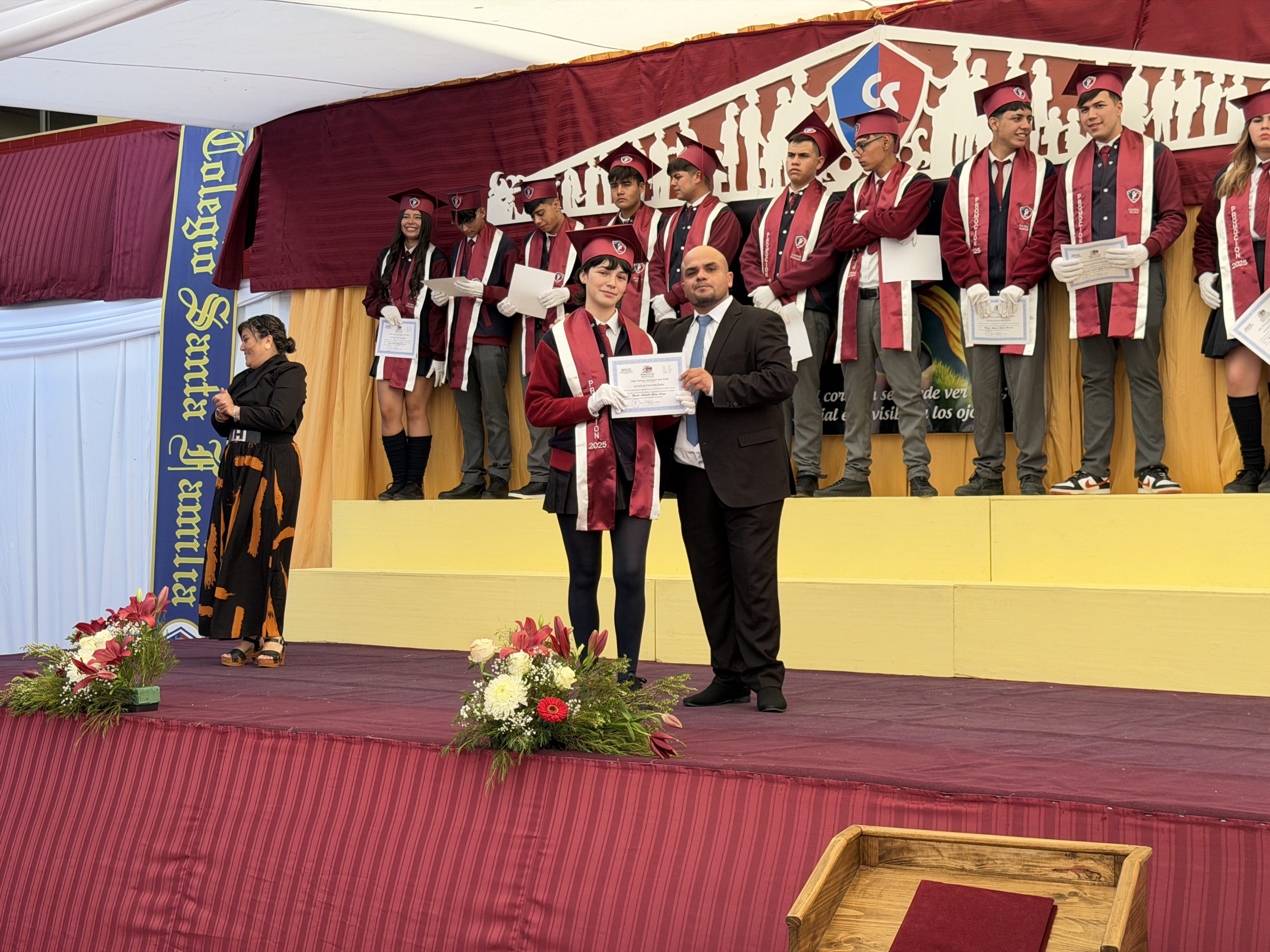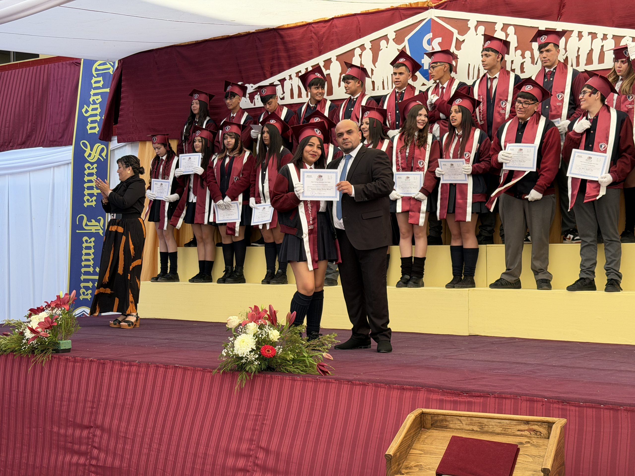 Uno de los hitos más significativos fue el Cambio de Estandarte y Bandera, donde los alumnos salientes entregaron los emblemas institucionales a los estudiantes de 3° Medio, confiándoles la misión de representar con gallardía los valores del Colegio Santa Familia.
