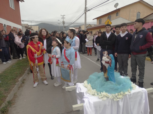 La procesión, acto religioso fundamental en nuestra tradición, consistió en una caminata en la que toda la comunidad educativa, incluidos estudiantes, docentes, padres y apoderados, recorrieron las distintas estaciones organizadas por los niveles educativos. En cada estación, se realizaron oraciones y se entregaron peticiones a la Sagrada Familia, simbolizando la fe y el compromiso de nuestra comunidad con los valores que nos guían.